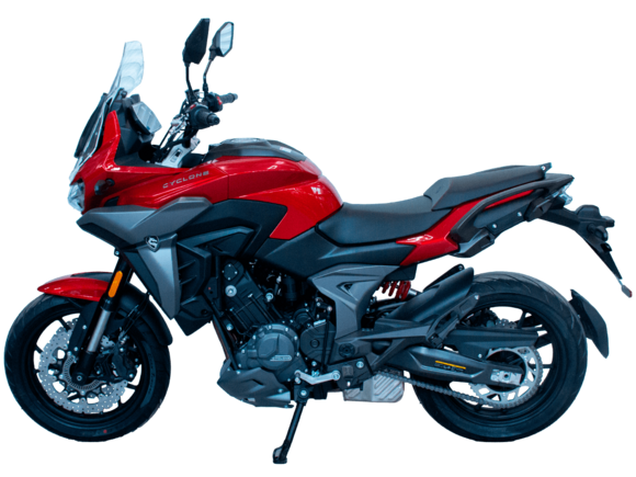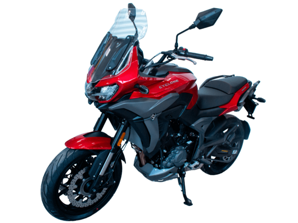 Мотоцикл CYCLONE RA600 – двухместный круизёр, готовый рассекать по городу и скоростным трассам. Лёгкая в управлении и надёжная модель с 550-кубовым двигателем, имеющая комфортный расход топлива для ежедневных поездок, хороший запас хода и оптимальную длину передач для маневрирования в потоке.Мотоцикл оснащён 2-цилиндровым 4-тактным двигателем ZS550SR жидкостного охлаждения с 4 клапанами на каждом цилиндре и 2 распредвалами. Двигатель имеет объём 550 см³ и способен обеспечить мощность в 59 л.с. при 8500 об/мин. Максимальный крутящий момент в 55 Нм достигается при 6500 об/мин. Подачу топлива обеспечивает инжектор BOSCH. Механическая коробка передач имеет 6 ступеней и схему 1-N-2-3-4-5-6.Максимальная скорость 165 км/ч.Объём топливного бака 14,5 литра.Колёса с легосплавными дисками имеют диаметр 16 дюймов. В качестве подвески используются телескопическая вилка и регулируемый маятник с моноамортизатором. Мотоцикл оснащён датчиками давления в шинах, показатели от которых выводятся на приборную панель. Клиренс в 150 мм позволяет комфортно проходить препятствия на дороге.Тормозная система произведена компанией J.JUAN, входящей в холдинг BREMBO. На оба колеса установлены гидравлические дисковые тормоза. Спереди установлен 2-поршневой суппорт, сзади используется однопоршневой суппорт с плавающей скобой. Дополнительную безопасность обеспечивают системы ABS и TCS. Они повышают устойчивость при экстренном торможении и на сложных поверхностях.Габариты модели 2190х855х1115 мм, снаряженная масса 198 кг. Высота по седлу 725 мм, колёсная база 1510 мм. Мотоцикл оснащён USB-портом для зарядки устройств.