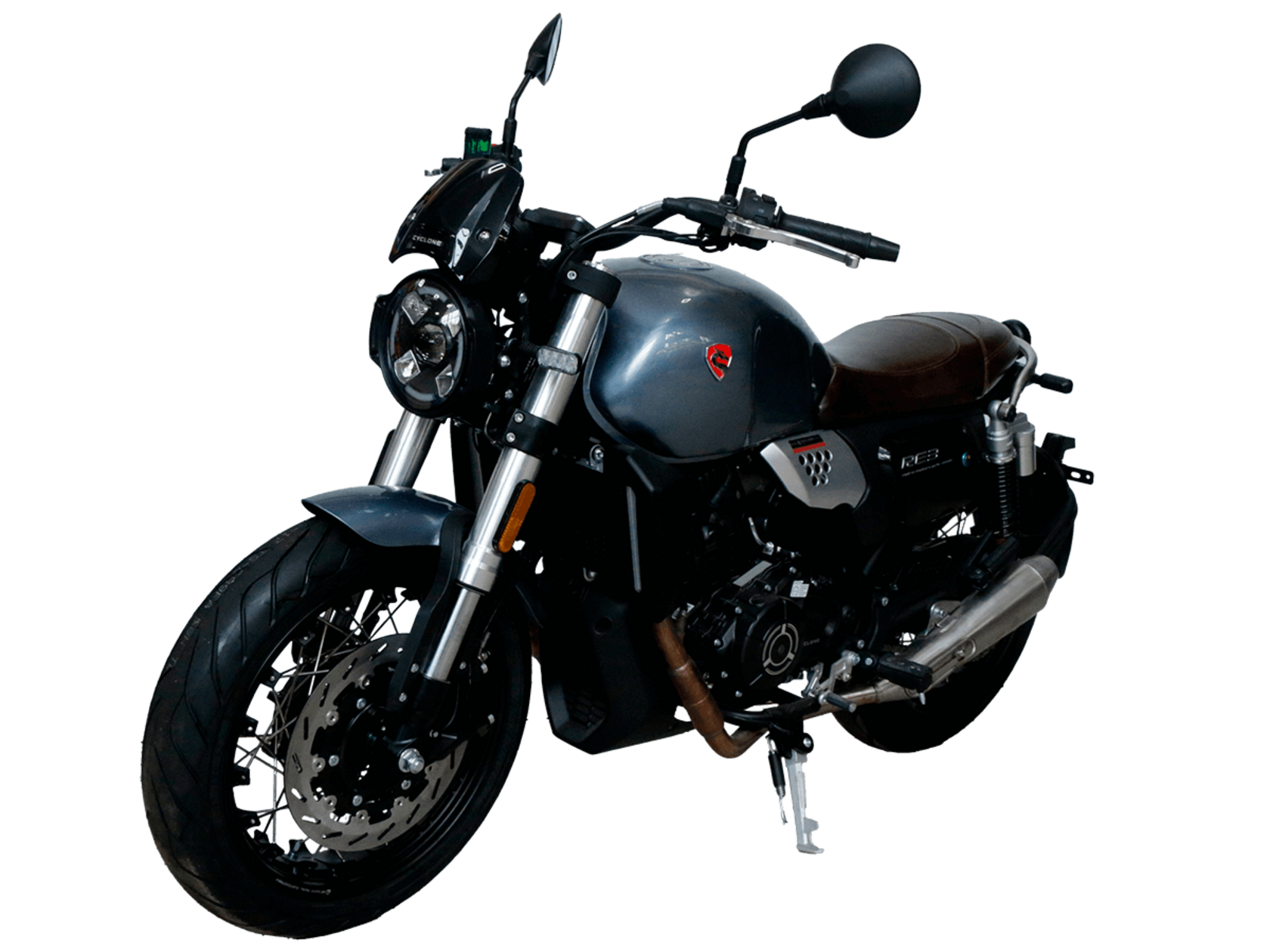 CYCLONE RE3 (SR400) – классик, в котором подчёркнутая простота объединяется с современными технологиями.Двухцилиндровый четырёхтактный двигатель объёмом 401 см3 выдаёт 43 л.с. на 9500 об/мин. Максимальный крутящий момент достигается на 8000 об/мин и составляет 34 Н·м. Инжекторный впрыск топлива с инжектором BOSCH увеличивает топливную экономичность, а также позволяет добиться высокой приёмистости и неприхотливости агрегата. Жидкостная система охлаждения не допустит перегрева двигателя даже при самом агрессивном вождении. На мотоцикл установлена 6-ступенчатая механическая коробка передач.Максимальная скорость мотоцикла составляет 140 км/ч.RE3 оснащён классическими спицованными колёсами диаметром 17 дюймов. Колёса обуты в бескамерные покрышки TIMSUN. С неровностями дороги эффективно справляются регулируемая телескопическая вилка перевёрнутого типа спереди и маятник с двумя амортизаторами сзади. Ход передней подвески составляет 110 мм, задней – 81 мм. Эффективное и безопасное замедление с любых скоростей обеспечивают гидравлические дисковые тормоза с ABS спереди и сзади.Клиренс мотоцикла составляет 145 мм. Объём топливного бака – 19 л. Снаряжённая масса – 186 кг.Из дополнительного оборудования можно выделить USB-порт, подсветку пультов и датчики давления в шинах.Мотоцикл сочетает в себе отличные технические характеристики, комфорт и надёжность, что позволяет вам ощутить настоящую свободу на любой дороге.