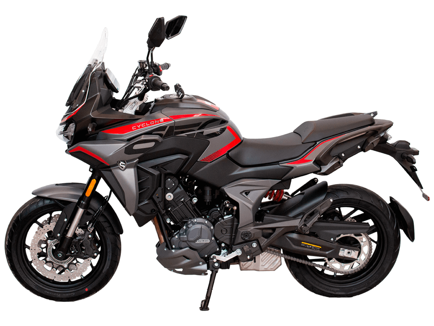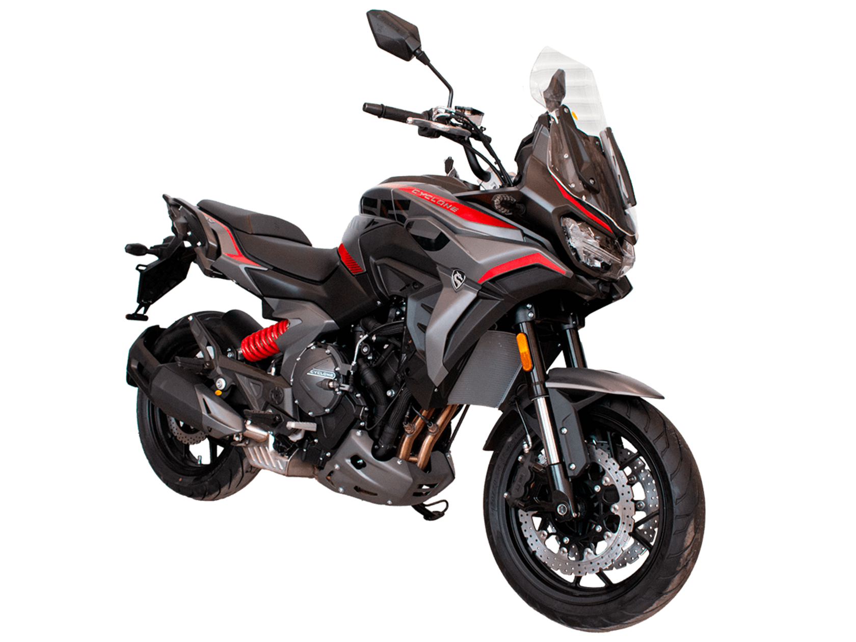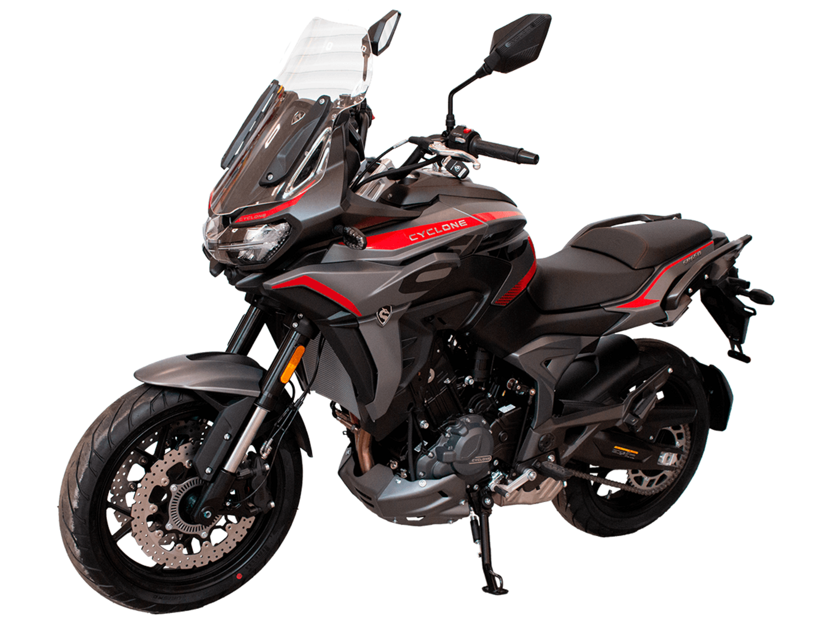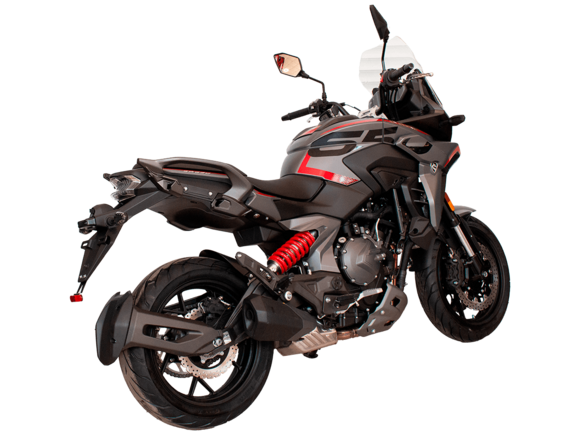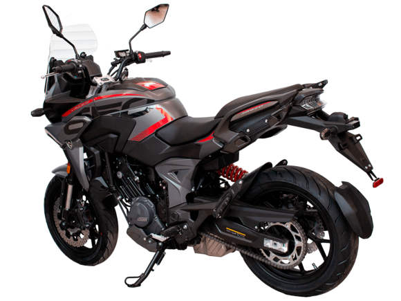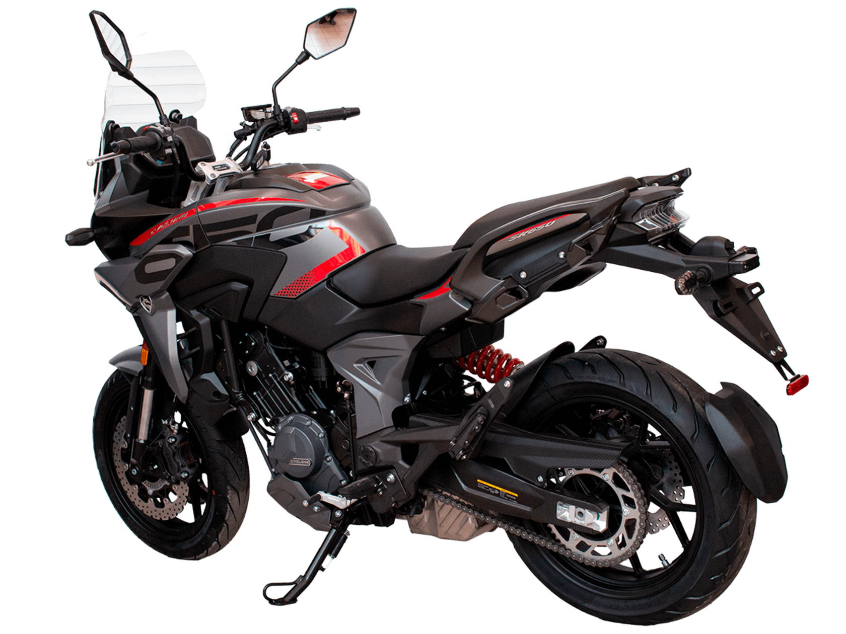 CYCLONE RX6 (SR650) – туристический эндуро для покорения самых непростых и протяжённых маршрутов. Он обладает агрессивным и современным дизайном, который выгодно выделяет его из всех остальных мотоциклов в своём классе. Мотоцикл дарит своему владельцу абсолютную свободу передвижения, позволяя долго и быстро ехать по шоссе, а при желании съезжать на такие дороги, по которым не проедет ни один дорожный мотоцикл. Небольшие габариты этого байка позволяют с успехом использовать его, как повседневный дорожный мотоцикл.Данная модель является самой крупнокубатурной в модельном ряде компании CYCLONE. Рядный двухцилиндровый четырёхтактный двигатель объёмом 650 см3 выдаёт мощность в 71 л.с. на 8500 об/мин. Максимальный крутящий момент достигается на 7000 об/мин и составляет 62 Н·м. Инжекторный впрыск топлива с блоком управления BOSCH увеличивает топливную экономичность, а также позволяет добиться высокой приёмистости и неприхотливости агрегата. Жидкостная система охлаждения не допустит перегрева двигателя даже при самом агрессивном вождении. На мотоцикл установлена 6-ступенчатая механическая коробка передач.Максимальная скорость мотоцикла составляет 180 км/ч.Модель оснащена литыми алюминиевыми дисками диаметром 17 дюймов. Колёса обуты в бескамерные покрышки от легендарной фирмы PIRELLI. С неровностями дороги эффективно справляются компоненты производства культовой японской компании KYB – телескопическая вилка перевёрнутого типа спереди и маятник с моноамортизатором сзади. Ход передней подвески составляет 130 мм, задней – 51 мм. Оба компонента подвески являются регулируемыми. Эффективное и безопасное замедление с любых скоростей обеспечивают гидравлические дисковые тормоза с двухканальной системой ABS спереди и сзади. Тормозные системы произведены известной испанской фирмой J.JUAN (входящей в легендарный холдинг BREMBO).Мотоцикл отличает хорошо продуманная компоновка с высоко расположенным радиатором. Высота 820 мм по седлу позволяет чувствовать себя комфортно даже райдерам небольшого роста. На данной модели установлена металлическая защита выхлопной системы и масляного фильтра. Под пассажирским сиденьем размещён небольшой, но крайне полезный набор инструментов.RX6 (SR650) оснащён бортовым компьютером с информативным цветным дисплеем и кнопками управления на руле, а также двумя штатными видеорегистраторами спереди и сзади. Из других приятных мелочей в допоборудовании мотоцикла стоит выделить регулируемое при помощи кнопки ветровое стекло, датчики давления в шинах, подсветку пультов, бесключевой доступ и 2 USB-порта.Клиренс мотоцикла составляет 165 мм. Объём топливного бака – 20 л. Снаряжённая масса – 245 кг.Мотоцикл сочетает в себе отличные технические характеристики, богатое оснащение, комфорт и надёжность, что позволяет вам ощутить настоящую свободу, отправившись на нём в любое путешествие.