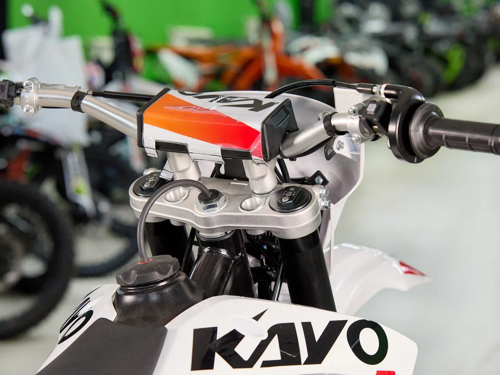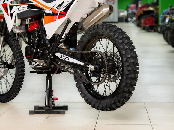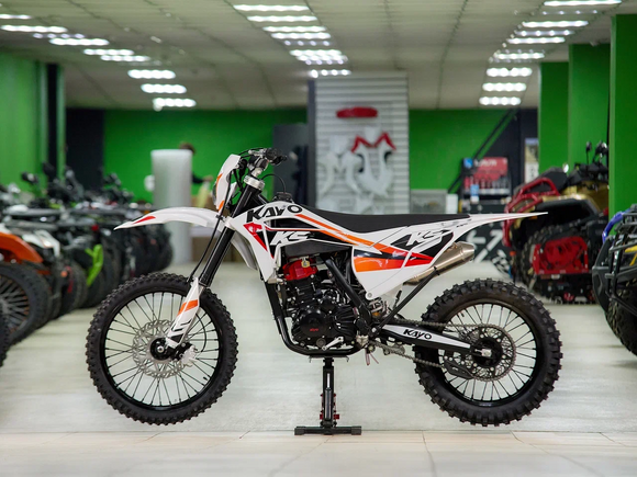 Кроссовый мотоцикл KAYO K5 Enduro – идеальный снаряд для внедорожного экстрима, представляющий собой оптимальный баланс производительности и технической оснащённости, поэтому он идеально подходит как новичкам, так и опытным райдерам. Удобный, простой и надёжный мотоцикл, который полностью оправдывает свою цену.Мотоцикл оснащён одноцилиндровым 4-тактным двигателем (ZONGSHEN NB300/ZS174MN-5) с балансирным валом и объёмом 280 см3, который обеспечивает высокую мощность (27 л.с.) и крутящий момент, что позволяет развивать большую скорость и с лёгкостью преодолевать трассы со сложным рельефом. Карбюратор NIBBI PWK34 обеспечивает бесперебойную работу техники в самых жестких условиях эксплуатации, простоту и лёгкость в обслуживании, а также неприхотливость к качеству топлива. Жидкостная система охлаждения не допустит перегрева мотора даже при самом агрессивном вождении. Аппарат оснащён 6-ступенчатой механической коробкой передач с классической схемой “1-N-2-3-4-5-6”.Усиленная рама из хром-молибденового сплава разработана фирмой KAYO. Передняя подвеска — регулируемая телескопическая вилка перевёрнутого типа длиной 880 мм, задняя — регулируемый моноамортизатор 470 мм с прогрессией, рассчитанный на высокие нагрузки. Оба компонента подвески произведены фирмой KKE. В паре они позволяют эффективно амортизировать удары при езде по неровностям и препятствиям на трассе. Мотоцикл оснащён классическими спицованными колёсами диаметром 18 и 21 дюйм. Эффективное и безопасное замедление с любых скоростей обеспечивают гидравлические дисковые тормоза.Мотоцикл достаточно компактен, поэтому он комфортен в эксплуатации одновременно и для мужчин среднего телосложения, и для девушек. Байк оснащён системой запуска двигателя при помощи кнопки электростартера или при помощи рычага кик-стартера.Высококачественная износостойкая резина с развитым протектором отлично держит дорогу на различных типах покрытия и в самых разных поворотах. Сиденье эргономичной формы покрыто антискользящим материалом. Данная модель укомплектована очень яркой фарой со светодиодным модулем, которая позволяет кататься и в ночное время.K5 Enduro сочетает в себе отличные технические характеристики, комфорт и надёжность, что позволяет вам ощутить настоящую свободу на любой трассе.