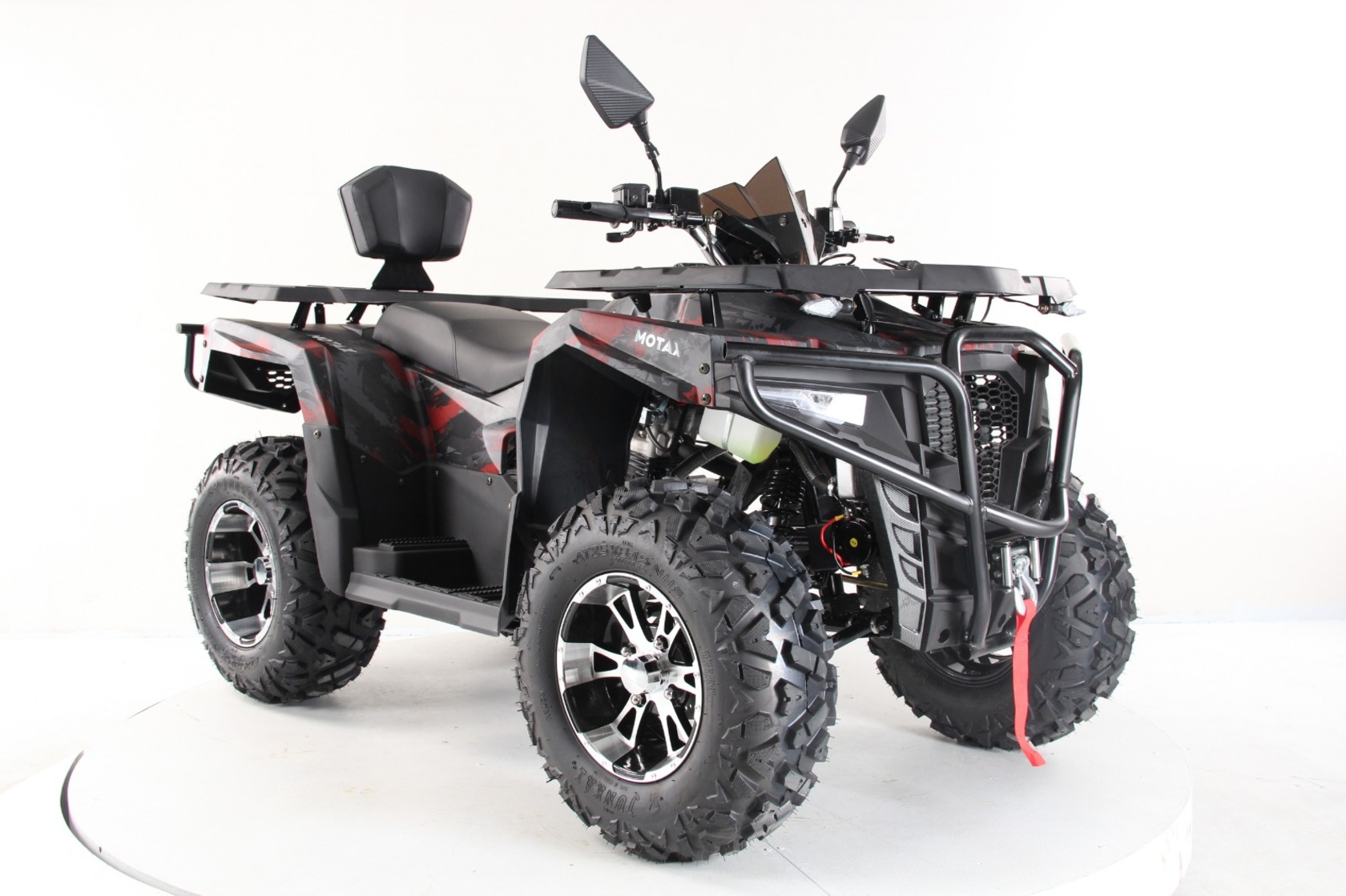 Комплектация Защита рук, лебёдка, фаркоп, приборная панель, передний и задний багажники, зеркала заднего вида, удерживающая спинка сидения и подножки для заднего пассажира.