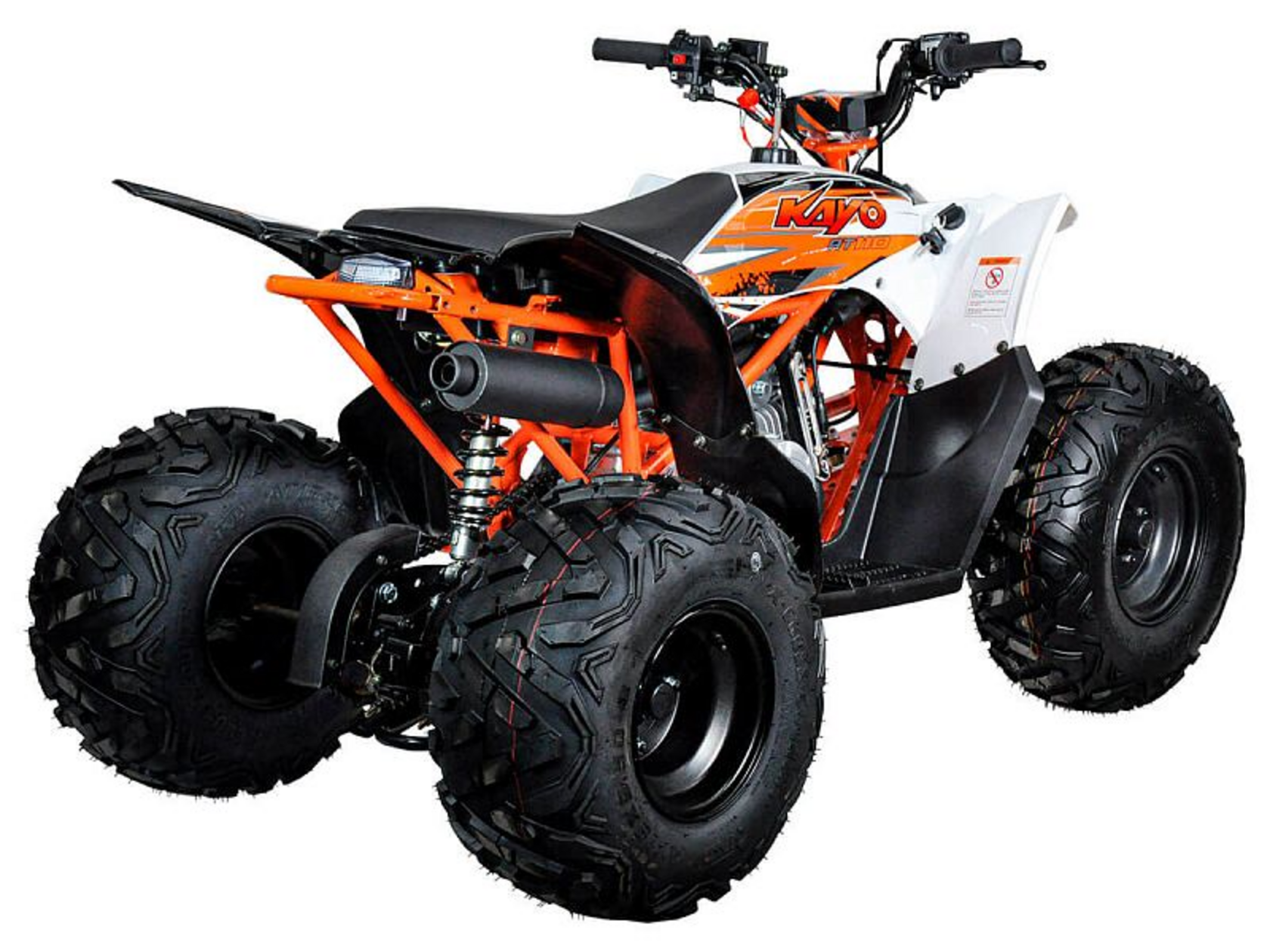 Представляем Вам надежный детский квадроцикл, выполненный в лучших традициях спортивных ATV. Вашему ребенку определенно понравится яркий и современный дизайн нового KAYO AT110. В целом, этот квадроцикл благодаря оптимальному сочетанию цены, мощности и качества, станет отличным вариантом в качестве первой техники для вашего ребенка.Модель AT110 оснащается 4-тактным двигателем KAYO с рабочим объемом в 110 куб. см. Вся мощность с помощью автоматической трансмиссии и цепного привода передается на заднюю ось. Квадроцикл очень прост и легок в управлении, поэтому у ребенка не возникнет проблем с освоением этой техники.Спереди используется двухрычажная подвеска. Сзади расположен моноамортизатор. Такая конфигурация может быть вам знакома по взрослым спортивным ATV. Тормоза гидравлические дисковые.На руле расположены все необходимые кнопки для управления функциями квадроцикла. Также здесь расположена кнопка аварийного выключения двигателя. Предусмотрен и ограничитель скорости.Квадроцикл Kayo AT110 построен на стальной трубчатой раме. Такая конструкция позволила сделать квадроцикл прочным и легким.