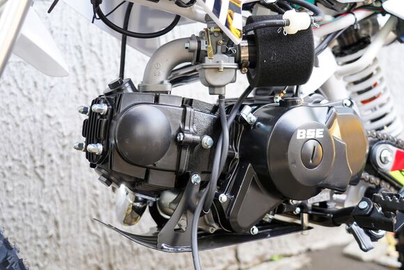 В мире питбайков BSE EVO 110e Twister A 14/12 заслуживает особого внимания. Этот крошечный гигант весит всего 59 кг, но его мотор способен поразить своей мощностью.Прежде всего, давайте заглянем под капот. Сердце этого питбайка - бензиновый 1-цилиндровый двигатель с объемом 110 см³. Модель YX 152 FMH привносит в мир двухколесных приключений 7.1 лошадиных сил. И это не просто цифры - это источник бесконечного веселья на бездорожье.Плавный запуск обеспечивается электростартером, делая каждый выезд моментом наслаждения. А с воздушным охлаждением двигателя можно быть уверенным в стабильной работе мотора даже в самых жарких условиях.BSE EVO 110e Twister A 14/12 готов к любым приключениям, благодаря своей передней подвеске в виде телескопической вилки перевернутого типа и маятниковой задней подвеске. Эти характеристики делают его непревзойденным выбором для тех, кто ищет удовольствие от катания по сложному рельефу.Кроме того, система тормозов с дисковыми механизмами способствует безопасности на дороге. Вы сможете остановиться вовремя даже при самых экстремальных условиях.Бак вмещает 3 литра топлива, что обеспечит вас достаточным запасом на множество захватывающих поездок. А благодаря полуавтоматической трансмиссии переключение передач становится простым и интуитивно понятным процессом.Когда заходит ночь, фары BSE EVO 110e Twister A 14/12 освещают ваш путь, позволяя наслаждаться катанием даже после захода солнца.