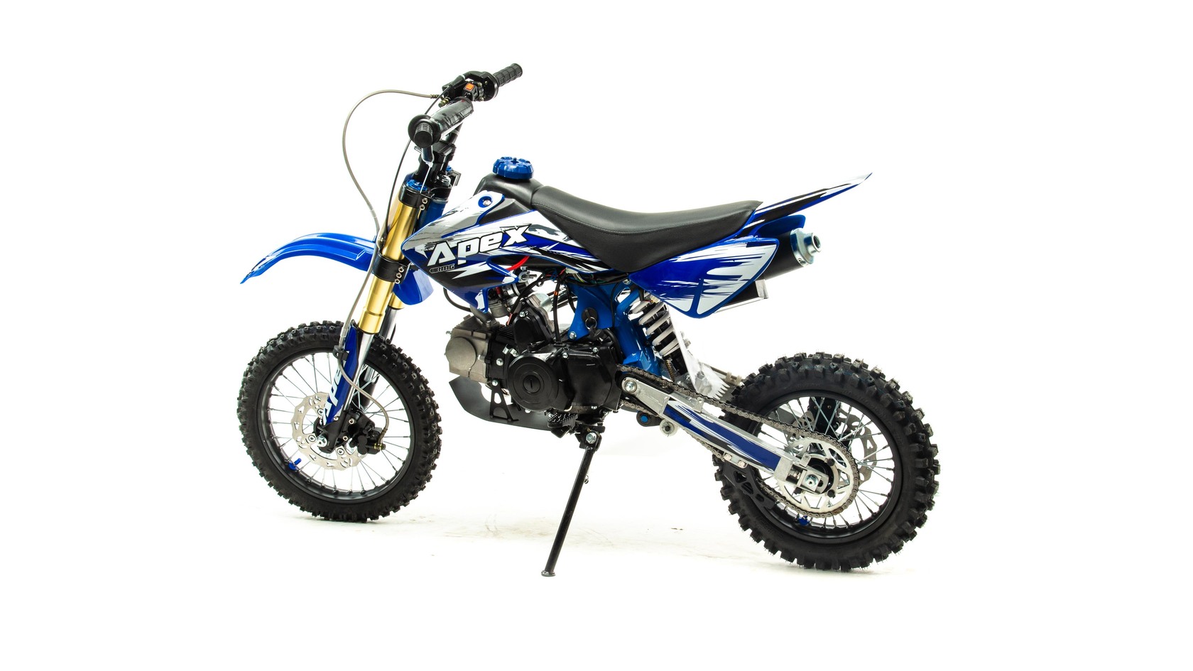 едорогой надёжный питбайк APEX10 идеален для поездок по грунтовым дорогам и бездорожью для детей которые уже научились ездить на маленьких мотоциклах объемом 50 куб.см. Хорошо чувствует себя на мягком и среднем грунте, разгоняется до 70 км/ч. Оснащён CNC траверсами, фарой, алюминиевыми ободами, весит всего 65 кг. Питбайк прост в управлении и не требует специального ухода.У кроссового мотоцикла APEX10 отличный узнаваемый дизайн. Конструкция подчёркивает неуступчивый спортивный характер питбайка, который не остановится ни перед одним препятствием. Пластик комбинированный, прочный, не ломается при сгибании. Кроссовый мотоцикл APEX10 доступен в красном и синем цвете, при этом в основной цвет окрашен не только пластик, но и обода колёс и другие детали питбайка.Передняя подвеска — телескопическая нерегулируемая вилка перевёрнутого типа, которая отлично подходит для преодоления ям, ухабов и других неровностей плохих дорог или их отсутствия. Задняя подвеска маятниковая с моноамортизатором. Руль 22 мм с высоким подъёмом и перекладиной удобен для мотоциклистов разного роста. Питбайк оснащён складными рычагами сцепления и переднего тормоза, а также CNC-лапкой переключения передач.Питбайк весит всего 65 кг, при этом выдерживает вес до 120 кг. Оснащён CNC траверсами, рама полудуплексная стальная, мотоцепь качественная. Колёса спицованные, сделаны из прочного и лёгкого алюминия. Размер заднего колеса — 12 дюймов, переднего — 14 дюйм. Тормоза дисковые, передний тормозной суппорт двухпоршневой, задний — однопоршневой.Питбайк оснащён карбюратором с фильтром нулевого сопротивления VM22 MIKUNI и одноцилиндровым четырёхтактным двигателем с воздушным охлаждением. Надёжный мотор мощностью 8 л. с. и объемом 110 см³ разгоняет кроссовый мотоцикл APEX10 до 70 км/ч. Коробка передач автоматическая, четырёхступенчатая. Система зажигания электронная (CDI), для запуска двигателя можно использовать кикстартер. Сверхпроходимость Покрышки с шипами и высоким грунтозацепом идеальны для бездорожья. Мощность мотора и небольшой вес питбайка позволяют ему преодолевать значительные препятствия и непролазную грязь, хорошо заходить в подъёмы.