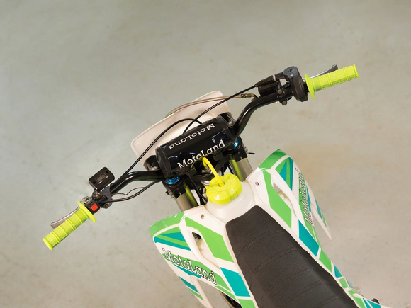 Питбайк Motoland TCX125 14/12 идеален для поездок по грунтовым дорогам и бездорожью. Хорошо чувствует себя на мягком и среднем грунте, разгоняется до 90 км/ч. Оснащён спортивными траверсами, весит всего 70 кг.Питбайк прост в управлении и не требует специального ухода, подойдёт как новичкам, так и любителям мотокросса.Питбайка отличный узнаваемый дизайн. Конструкция подчёркивает неуступчивый спортивный характер, который не остановится ни перед одним препятствием.Комбинированный прочный пластик не ломается при сгибании.Передняя подвеска — телескопическая вилка перевёрнутого типа (с регулировкой по давлению воздуха), которая отлично подходит для преодоления ям, и других неровностей плохих дорог или их отсутствия. Задняя подвеска маятниковая с моноамортизатором. Мотоцикл оснащён одноцилиндровым четырёхтактным двигателем с воздушным охлаждением. Надёжный мотор 152FMI мощностью 8 л. с. и объемом 125 см³ , установленный на усиленной стальной раме, коробка передач автоматическая, четырёхступенчатая.Тормоза дисковые, передний тормозной суппорт двухпоршневой, задний — однопоршневой.Питбайк относится к недорогим моделям, которые при должной эксплуатации работают без сбоев. Не занимает много места в гараже. При необходимости в нём легко сменить любую повреждённую деталь.